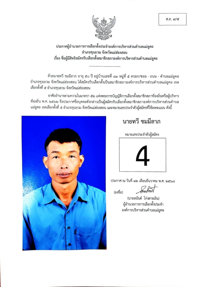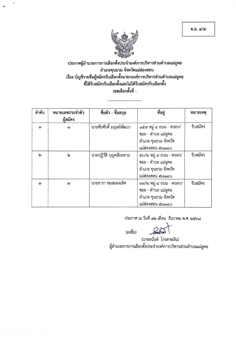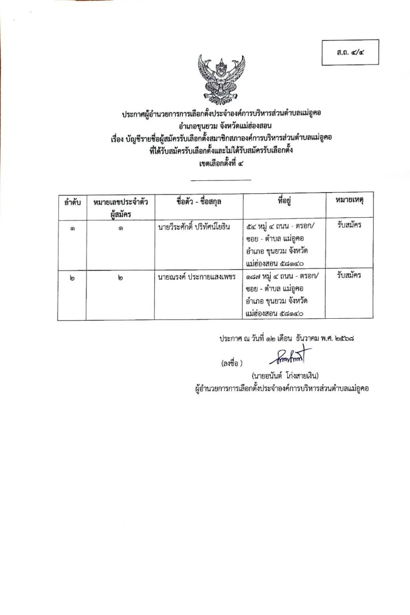 บัญชีรายชื่อผู้สมัครรับเลือกตั้งสมาชิกสภาองค์การบริหารส่วนตำบล เขตเลือกตั้งที่ 4