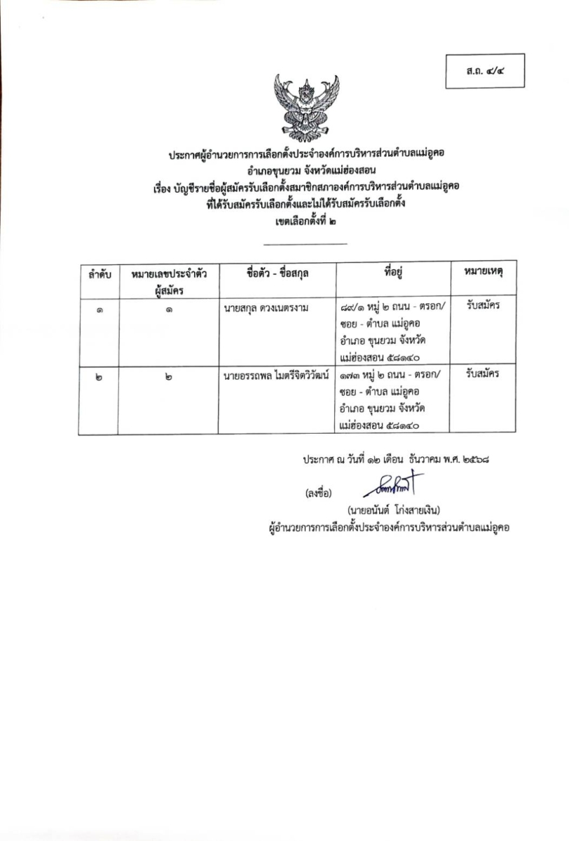 บัญชีรายชื่อผู้สมัครรับเลือกตั้งสมาชิกสภาองค์การบริหารส่วนตำบล เขตเลือกตั้งที่ 2