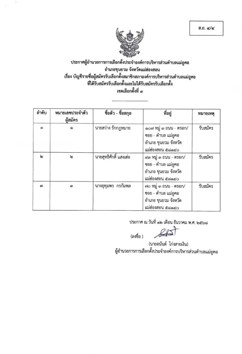 บัญชีรายชื่อผู้สมัครรับเลือกตั้งสมาชิกสภาองค์การบริหารส่วนตำบล เขตเลือกตั้งที่ 3