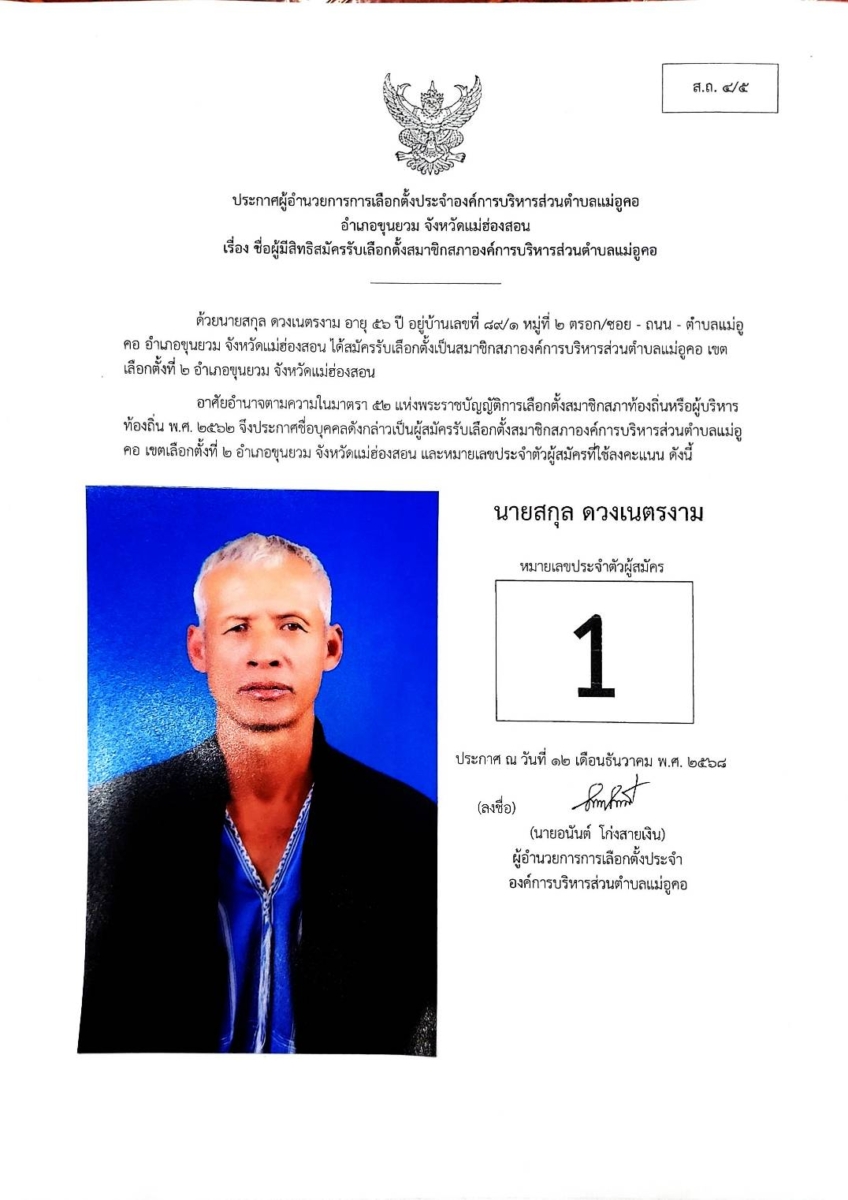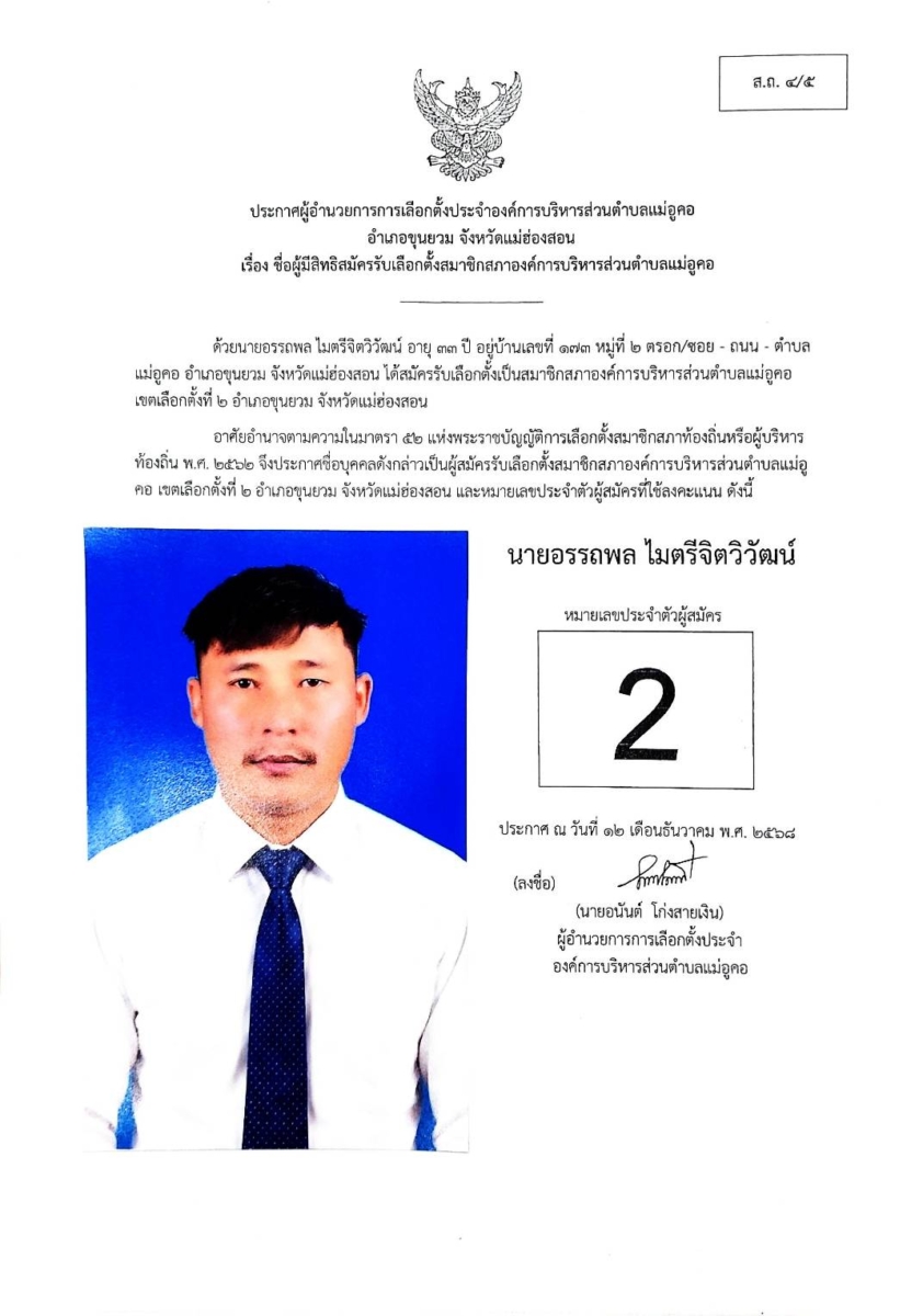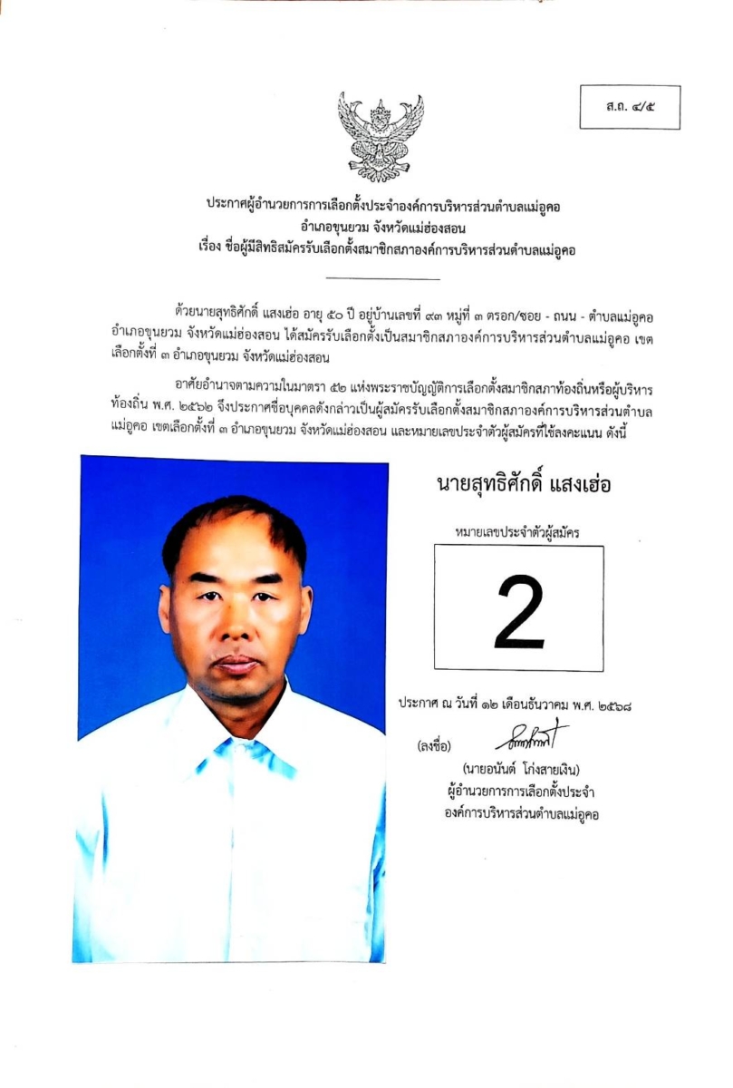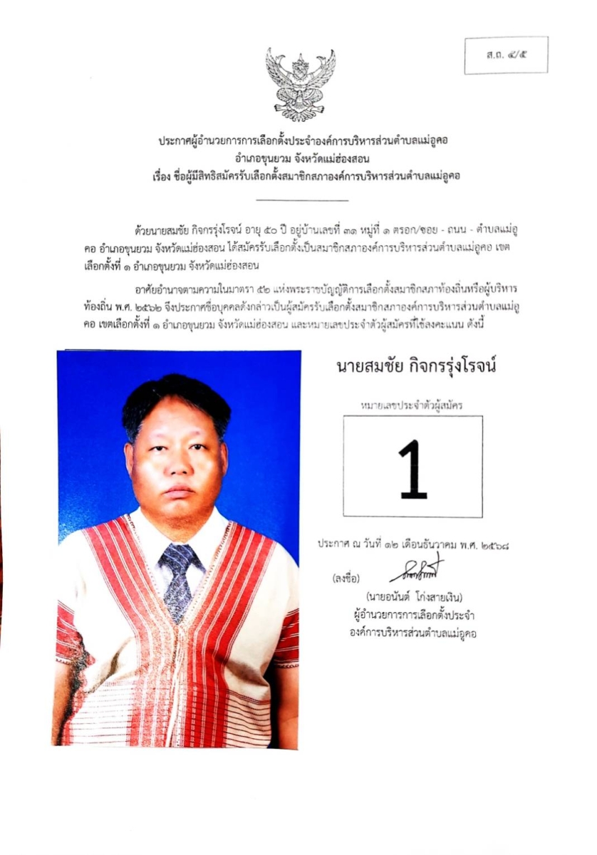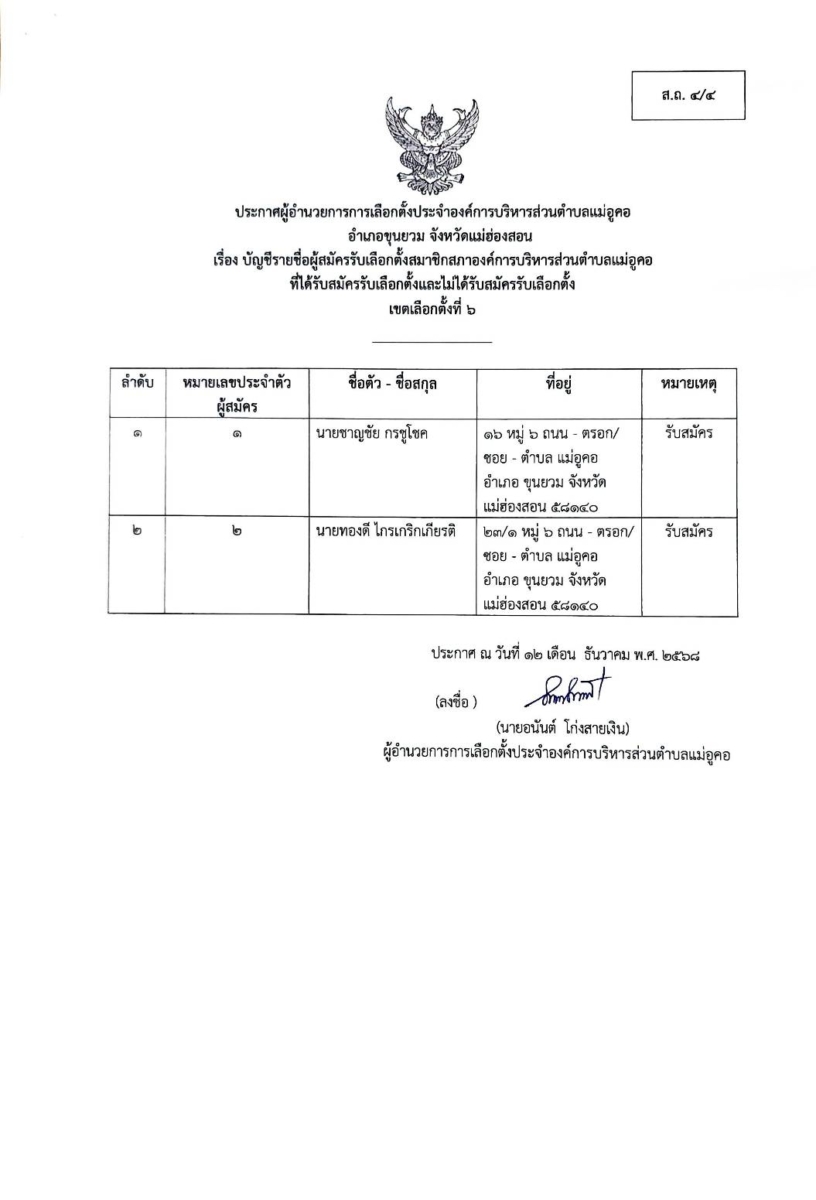 บัญชีรายชื่อผู้สมัครรับเลือกตั้งสมาชิกสภาองค์การบริหารส่วนตำบล และนายกองค์การบริหารส่วนตำบลแม่อูคอ