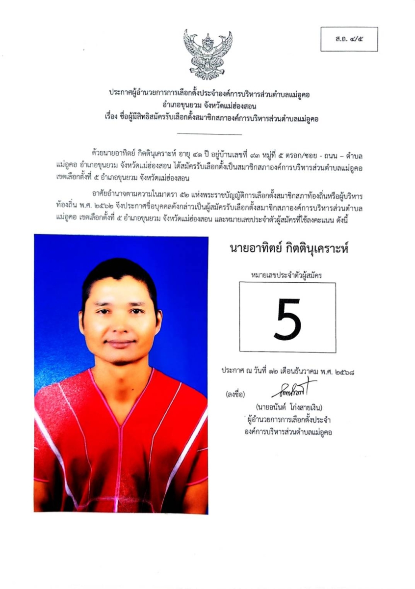 บัญชีรายชื่อผู้สมัครรับเลือกตั้งสมาชิกสภาองค์การบริหารส่วนตำบล เขตเลือกตั้งที่ 5