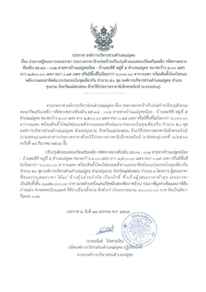 ประกาศผู้ชนะการเสนอราคา ประกวดราคาจ้างก่อสร้างปรับปรุงผิวถนนคอนกรีตเสริมเหล็ก สายทางบ้านแม่อูคอน้อย – บ้านพะทิคี หมู่ที่ 5 ตำบลแม่อูคอ พร้อมติดตั้งโคมไฟถนนพลังงานแสงอาทิตย์แบบประกอบในชุดเดียวกัน จำนวน 50 ชุด ด้วยวิธีประกวดราคาอิเล็กทรอนิกส์ (e-bidding)