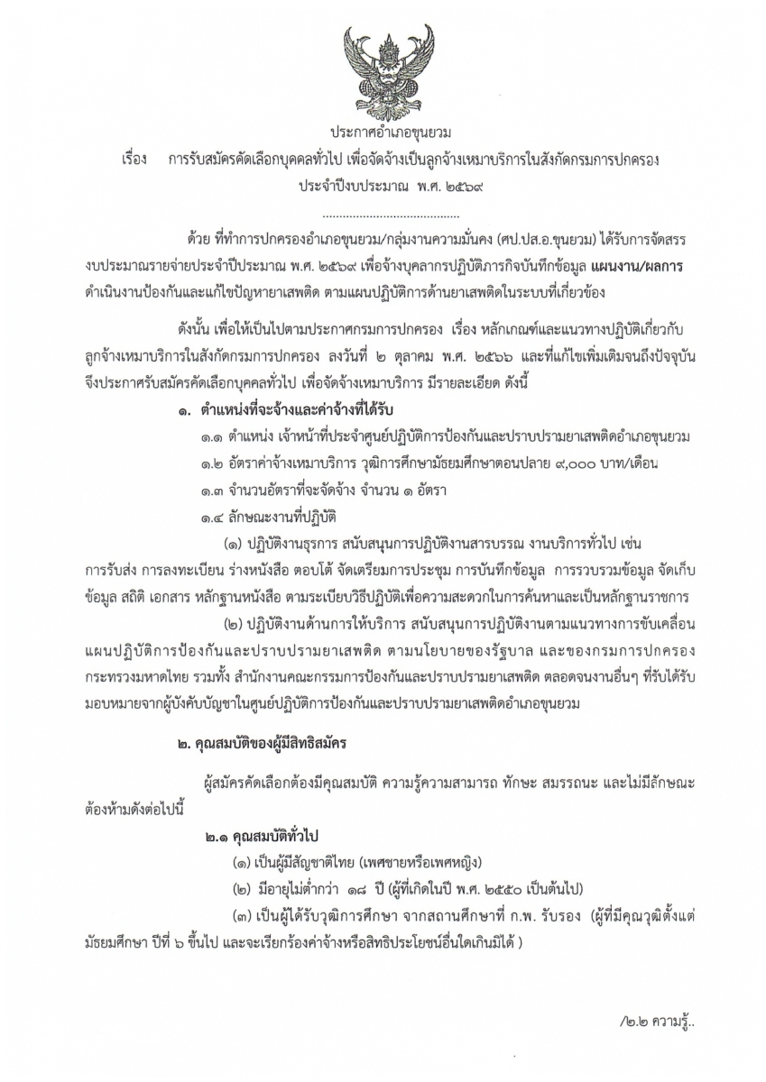 ประกาศ “การรับสมัครคัดเลือกบุคคลทั่วไป เพื่อจัดจ้างเป็นลูกจ้างเหมาบริการในสังกัดกรมการปกครอง ประจำปีงบประมาณ พ.ศ.2569 จำนวน 1 อัตรา” (รายละเอียดและใบสมัครตามเอกสารแนบท้าย)