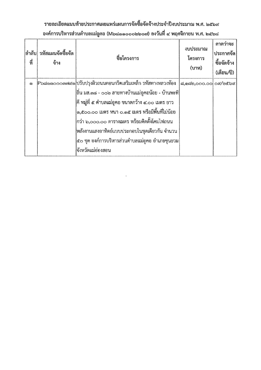 ประกาศผู้ชนะการเสนอราคา โครงการพัฒนาแหล่งท่องเที่ยวทุ่งดอกบัวตองดอยแม่อูคอ หมู่ 1 , หมู่ 3 , หมู่ 4 และ หมู่ 6