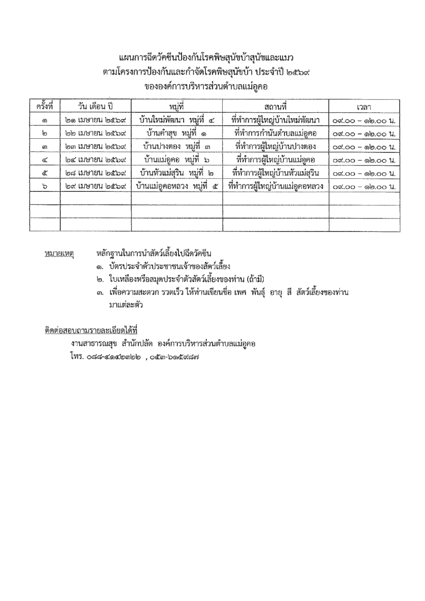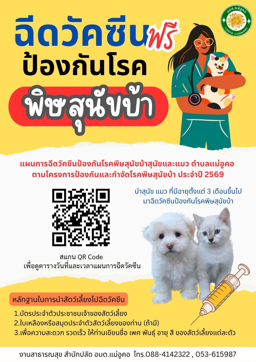 ประชาสัมพันธ์ แผนการฉีดวัคซีนป้องกันโรคพิษสุนัขบ้าสุนัขและแมว ตำบลแม่อูคอ ตามโครงการป้องกันและกำจัดโรคพิษสุนัขบ้า ประจำปี 2569