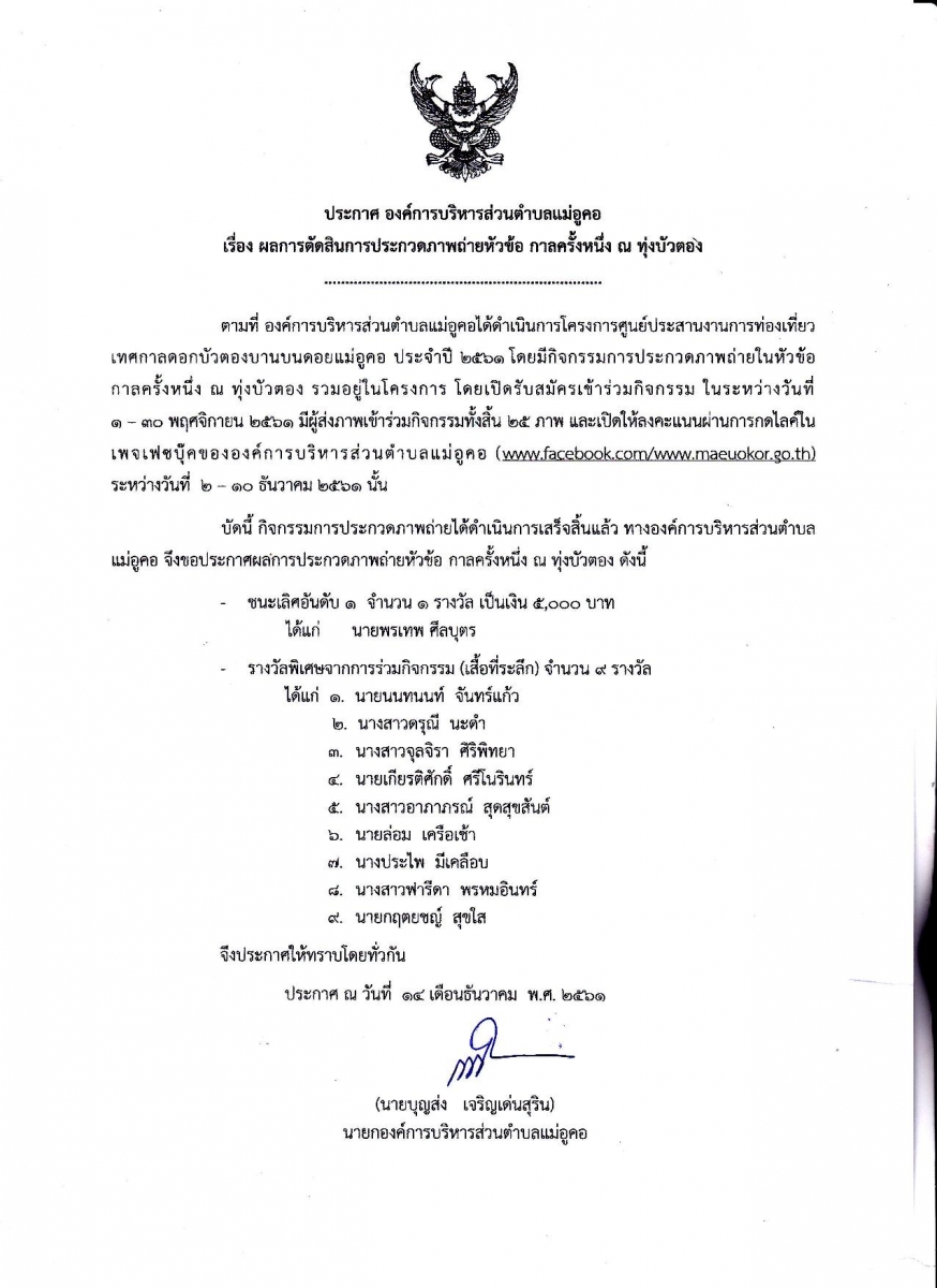 ผลการตัดสินการประกวดภาพถ่ายหัวข้อ กาลครั้งหนึ่ง ณ ทุ่งบัวตอง 14 ธ.ค. 2018 1,161 views admin FacebookTwitterGoogle PlusLine Categories: ข่าวประชาสัมพันธ์